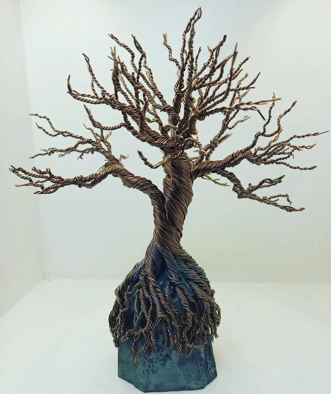 A burnished bronze wire tree set on to a stunning high grade Amethyst. With particular attention paid to the root system of the tree as it wraps around this exceptional geode with its deep purple tones. This simple design is elegant working to compliment the beautiful crystal.